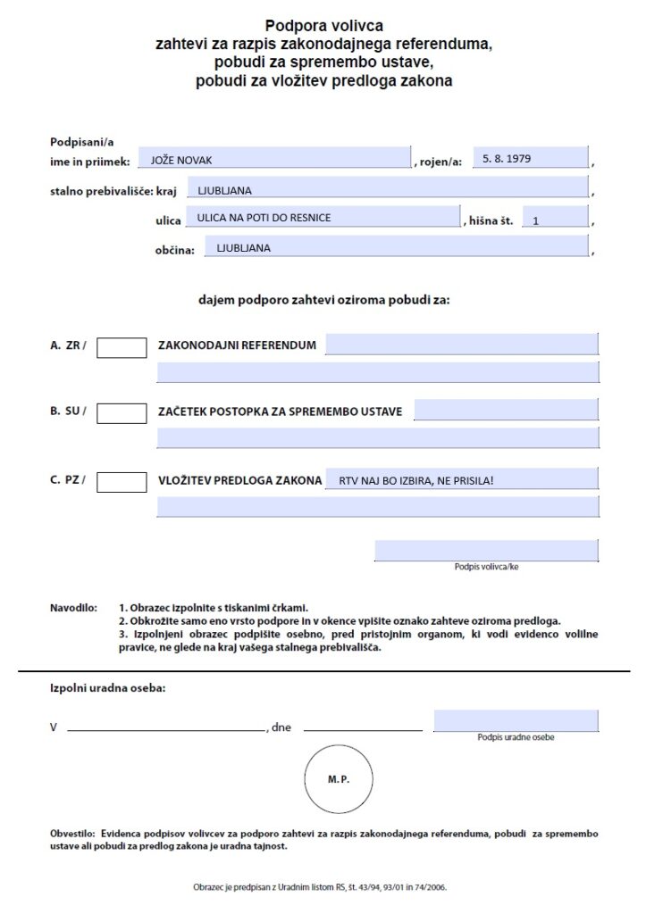 V FIZIČNI OBLIKI je primer pravilno izpolnjenega obrazca viden na levi strani. Lahko ga predhodno natisneš in izpolniš doma, lahko pa to opraviš na kateri koli upravni enoti. Tam se obrazec po izpolnitvi tudi overi. Po novih določilih se obrazcev ne pošilja več pobudniku, ampak to namesto nas opravi upravna enota, kar pomeni, da obrazec po overitvi pustiš tam. Prazen obrazec je dosegljiv TUKAJ.